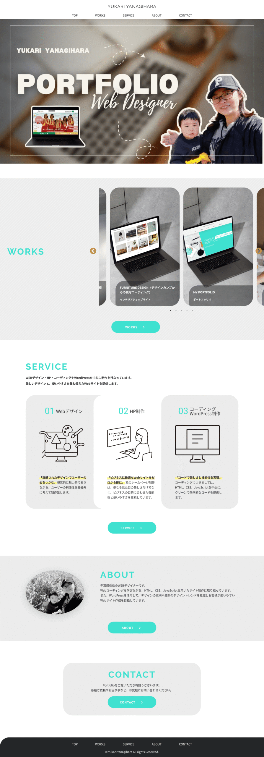 → 「Webデザイン」「HP制作」「コーディング/WordPress制作」と3区分で整理。スキルを提明確に提示 2)制作プロセス(Flow)の可視化